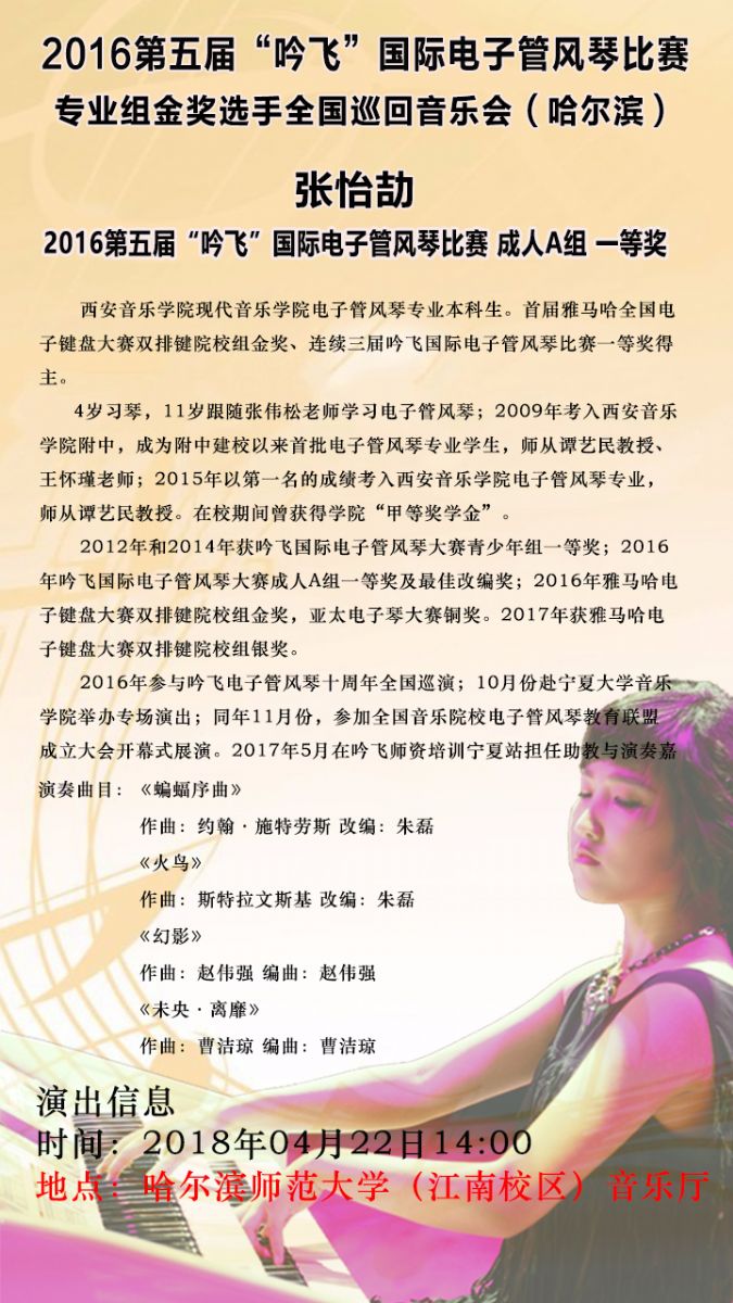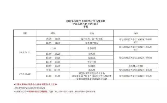 4月21日—4月22日第六屆“吟飛”國際電子管風琴比賽中國東北大賽(哈爾濱)即將開賽,本次比賽將在哈爾濱師范大學江南校區(qū)舉辦。