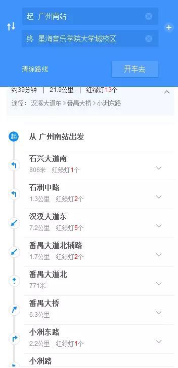 廣州南站→石興大道南→石洲中路→S39東新高速→鐘村隧道→祈福隧道→金山大道西→S73南沙港快速→北亭村大街→大學城外環(huán)西路→星海音樂學院大學城校區(qū)
