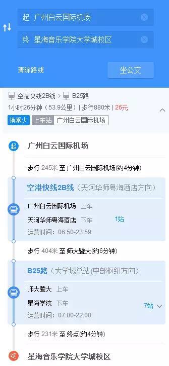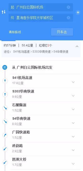 S41機場高速→S303華南快速→石陂隧道→S4華南快速→小洲東路→小洲路→大學城外環(huán)西路→星海音樂學院大學城校區(qū)