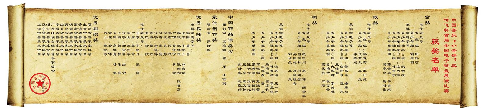 在8月7日晚中國音樂“小金鐘”獎“吟飛杯”首屆全國電子鍵盤展演比賽頒獎音樂會上,中國音樂家協(xié)會和常州市各級領(lǐng)導(dǎo)也應(yīng)邀參加了頒獎音樂會,并為獲得兩個大類、共6個組別的金、銀、銅獎,和中國作品演奏獎、最佳創(chuàng)作獎、優(yōu)秀教師獎以及優(yōu)秀組織獎選手、教師頒獎。隨后,各級別獲得金、銀、銅獎的選手分別為大家獻(xiàn)上了自己的獲獎曲目,再一次展現(xiàn)了各自在電子鍵盤和音樂上的演繹水平及休養(yǎng)。最后,由吟飛藝術(shù)中心和比賽獲獎選手共同演繹的一首由著名管風(fēng)琴與電子管風(fēng)琴演奏家、上海音樂學(xué)院現(xiàn)代器樂與打擊樂系主任---朱磊教授作曲、編曲,氣勢恢宏、大氣磅礴的《曙光》,將整場頒獎音樂會推向了高潮,并為中國音樂“小金鐘”獎“吟飛杯”首屆全國電子鍵盤展演比賽畫上了圓滿的句號。