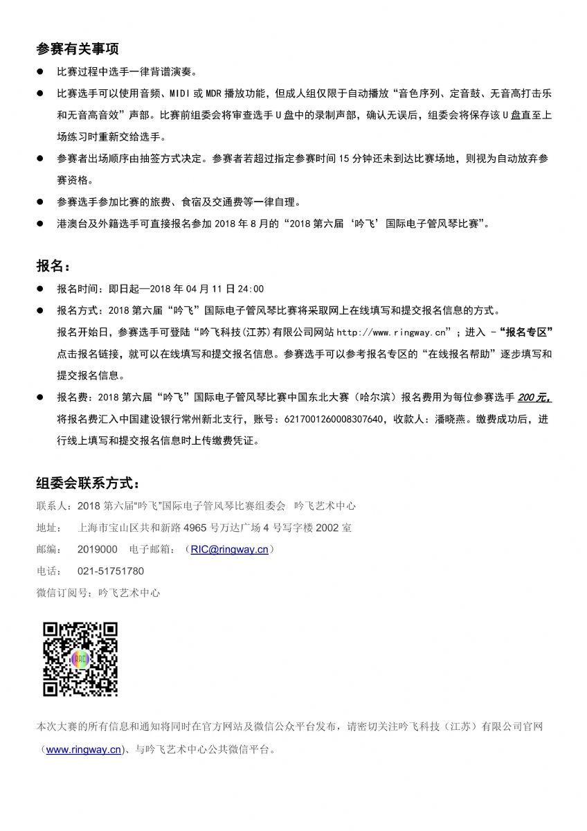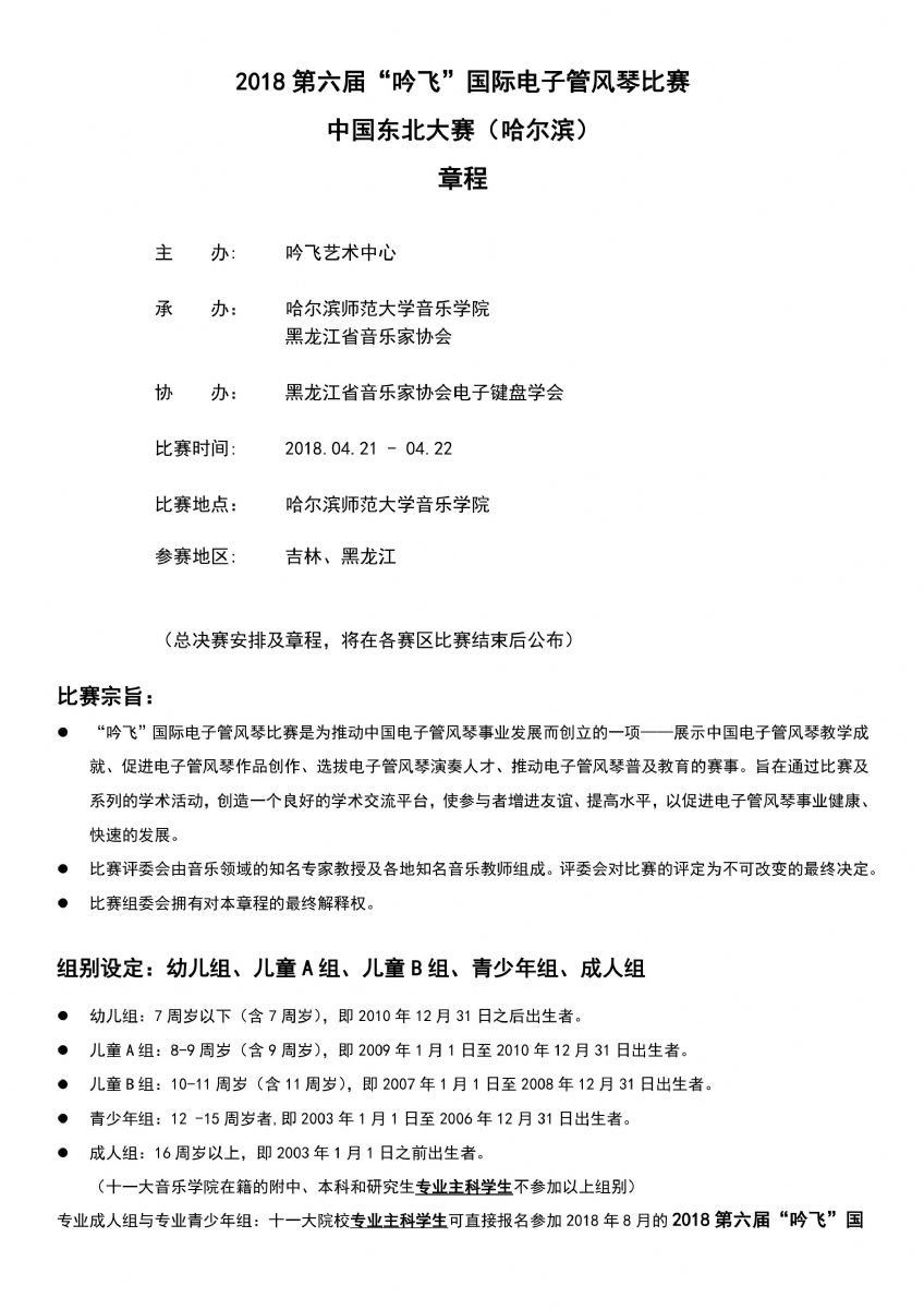 2018第六屆“吟飛”國際電子管風(fēng)琴比賽中國東北大賽(哈爾濱)賽區(qū)參賽指南和詳細(xì)賽程稍后也將發(fā)布,請隨時關(guān)注“吟飛科技(江蘇)有限公司官網(wǎng)www.qiandftg33.cn”和“吟飛藝術(shù)中心”微信公眾號。