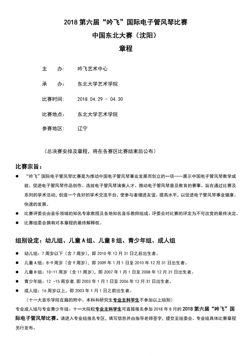 2018第六屆“吟飛”國際電子管風琴比賽中國東北大賽(沈陽)賽區(qū)報名通道于3月19日—4月16日開啟,請各位要報名的選手不要錯過啦~