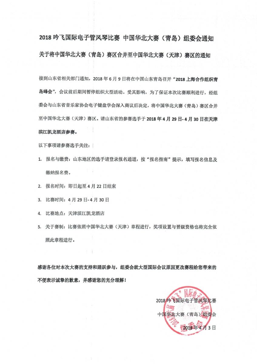接到山東省相關(guān)部門通知,2018年6月9日將在中國(guó)山東青島召開(kāi)“2018上海合作組織青島峰會(huì)”,會(huì)議前后期間暫停組織大型活動(dòng)。受其影響,為了保證本次比賽順利進(jìn)行,經(jīng)組委會(huì)與山東省音樂(lè)家協(xié)會(huì)電子鍵盤(pán)學(xué)會(huì)深入商議后決定,將中國(guó)華北大賽(青島)賽區(qū)合并至中國(guó)華北大賽(天津)賽區(qū)。請(qǐng)山東省的參賽選手于2018年4月29日- 4月30日在天津?yàn)I江凱龍酒店參賽。