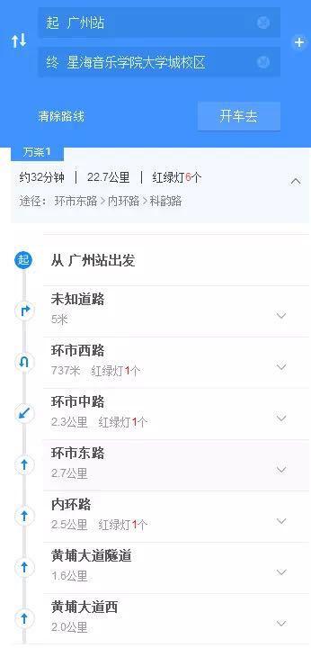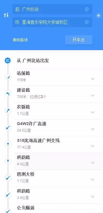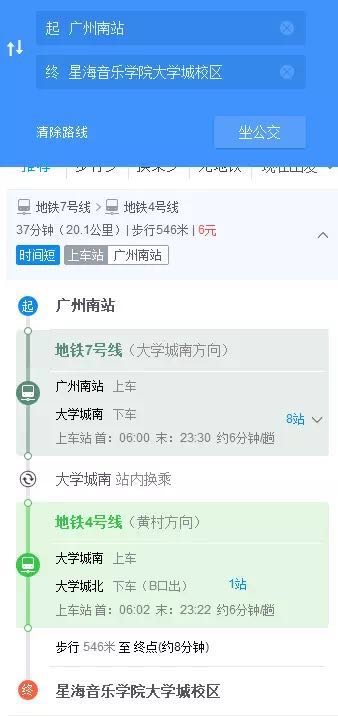 站前路→建設(shè)路→農(nóng)新路→G4W2許廣高速→G15沈海高速→S4華南快速→小洲東路→小洲路→大學(xué)城外環(huán)西路→星海音樂學(xué)院大學(xué)城校區(qū)