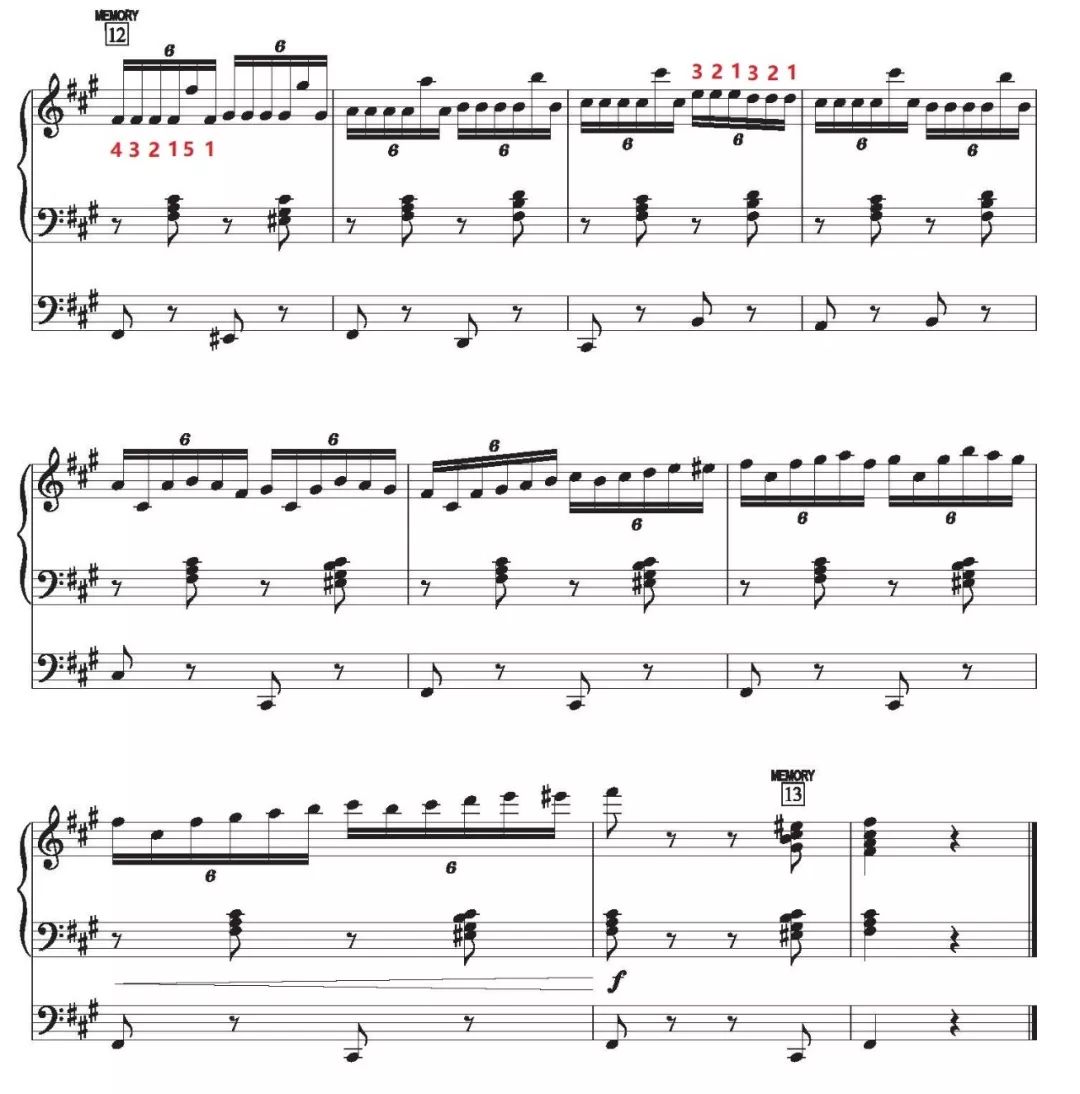 圖3中的同音重復(fù)用輪指演奏更加容易,就好像在腳鍵盤的同音重復(fù)中,我們會使用腳尖、腳跟交替演奏一樣。另外,建議用跳音的方式練習右手的16分音符6連音,練習后的成效絕.對會令你驚訝!